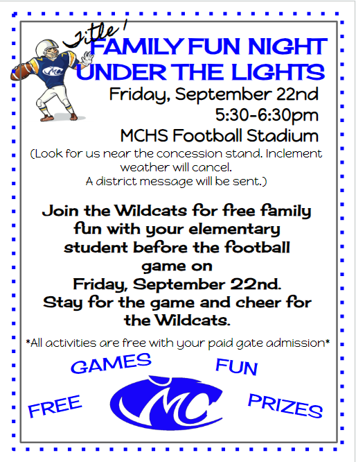 We NEED YOUR HELP!!!! Please look for a way that you can help support our PTO Carnival through your service or support or both. Events like the Carnival are not possible without the helping hands of many people. Please let us know how you can help by calling the school or emailing rhans@mc-wildcats.org . Grandmas, grandpas, aunts, uncles, friends and community members are all welcome to sign up to work. THANK YOU for supporting our PTO, our students and our staff.